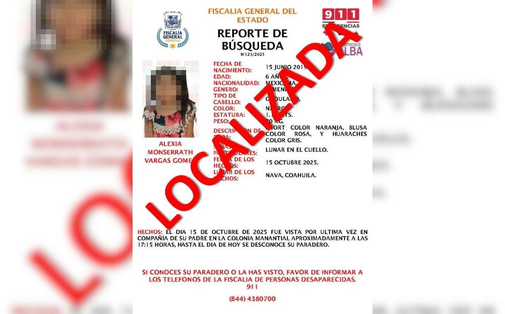 NAVA, COAH.- La Fiscalía de Personas Desaparecidas, en conjunto con la Fiscalía de las Mujeres y la Niñez, confirmó la localización de Alexia Monserrath Vargas Gómez, de seis años, reportada como sustraída por su padre el pasado miércoles 15 de octubre en la colonia Manantial, municipio de Nava.