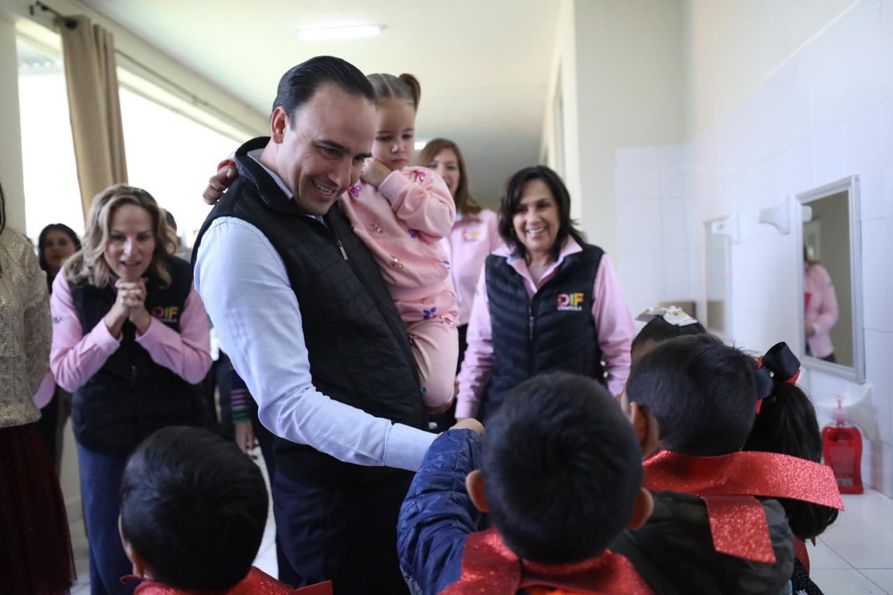 El gobernador de Coahuila, Manolo Jiménez Salinas, acompañado por su esposa, Paola Rodríguez López, sus hijos y Liliana Salinas Valdés, presidenta honoraria del DIF Coahuila, celebró la tradicional posada navideña con los menores de las casas hogar Casa Rosa, Casa Azul y Casa Cuna.