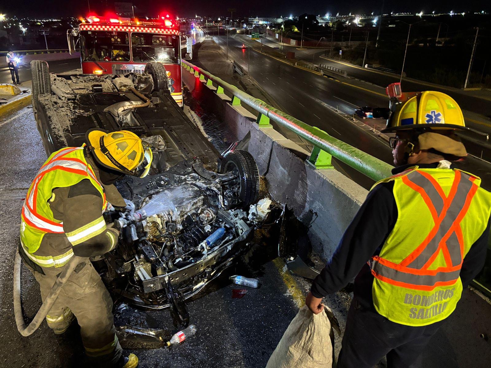 Tras presuntamente perder el control del volante debido al exceso de velocidad, el conductor de un vehículo Mazda terminó volcado sobre el distribuidor vial “El Sarape” durante la madrugada de este domingo, en Saltillo.