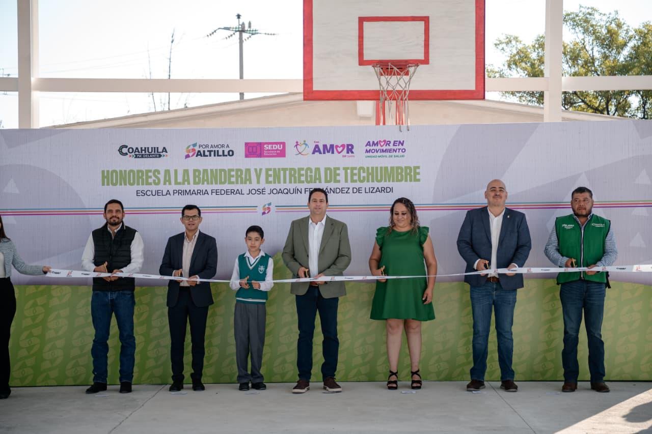 El alcalde de Saltillo, Javier Díaz González, afirmó que con el apoyo del gobernador Manolo Jiménez Salinas se trabaja diariamente en programas y acciones que impacten positivamente en la calidad de vida de la población, durante la entrega de una techumbre en la Escuela Primaria José Joaquín Fernández de Lizardi, ubicada en la colonia Satélite Norte.