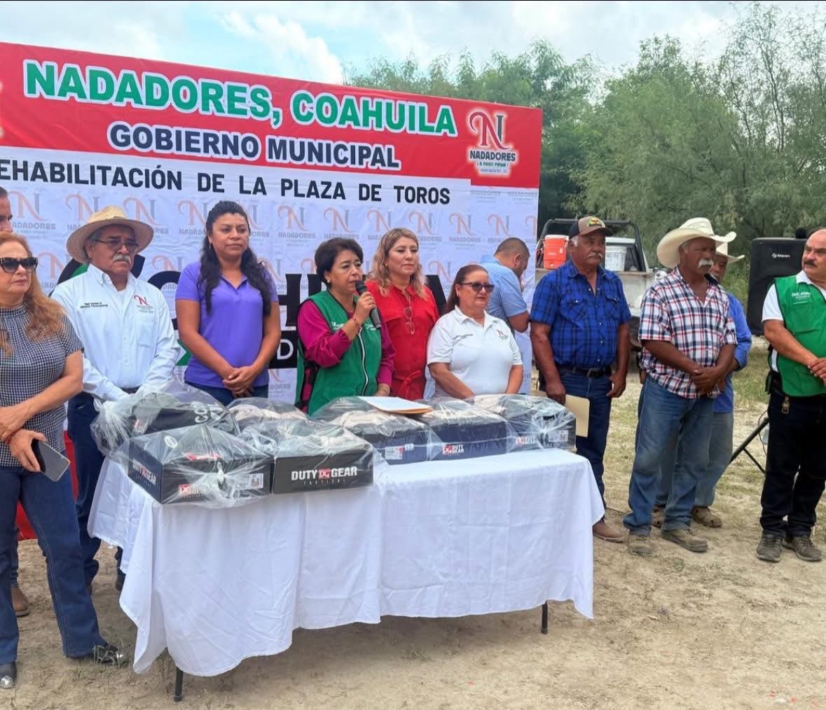 Este miércoles 8 de octubre, la alcaldesa de Nadadores, Alejandra Huerta, encabezó la entrega de materiales para la rehabilitación de la Plaza de Toros del Ejido San Isidro, un espacio emblemático que une a las familias, impulsa la convivencia y fortalece las tradiciones que distinguen al municipio. Durante el mismo evento, se realizó también la dotación de nuevo equipamiento para el departamento de Protección Civil.