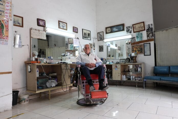 En la plática, don Fidel Luna, de 91 años de edad, no tarda en confesar: “Me siento cansado”. Luego, hace un silencio, pero sin dejar de recorrer con sus tijeras el cuero cabelludo del visitante en turno.