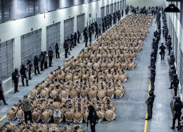 Fotografías publicadas por el gobierno de El Salvador el año pasado mostraban a guardias de la prisión con equipo antidisturbios moviendo a reclusos sin camisa y muy tatuados por las instalaciones, donde grupos de detenidos parecen estar alojados juntos en celdas estrechas.