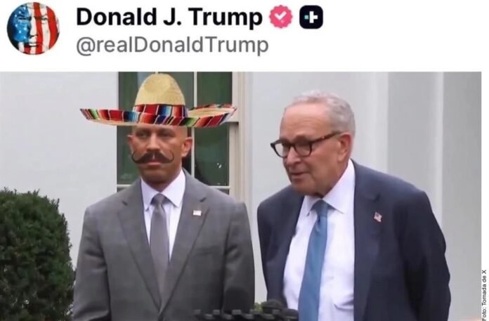 El Presidente de EU publicó en su cuenta de Truth Social un video con inteligencia artificial que muestra a Hakeem Jeffries, líder en la Cámara de Representantes, con sombrero mexicano y bigote.