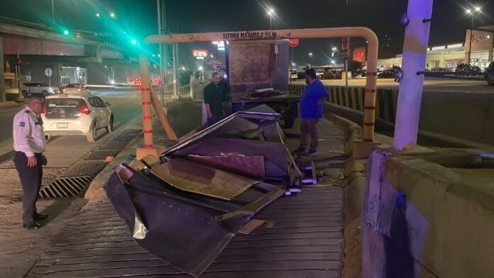 La caja quedó completamente destruida, y ahora el tripulante, quien tenía una semana de haber iniciado su empleo como chofer, tendrá que responder por el delito de daños. Todo ocurrió cerca de las 8:30 de la noche, cuando el operador circulaba en una camioneta Nissan NP, color blanco, sobre el periférico Luis Echeverría Álvarez.