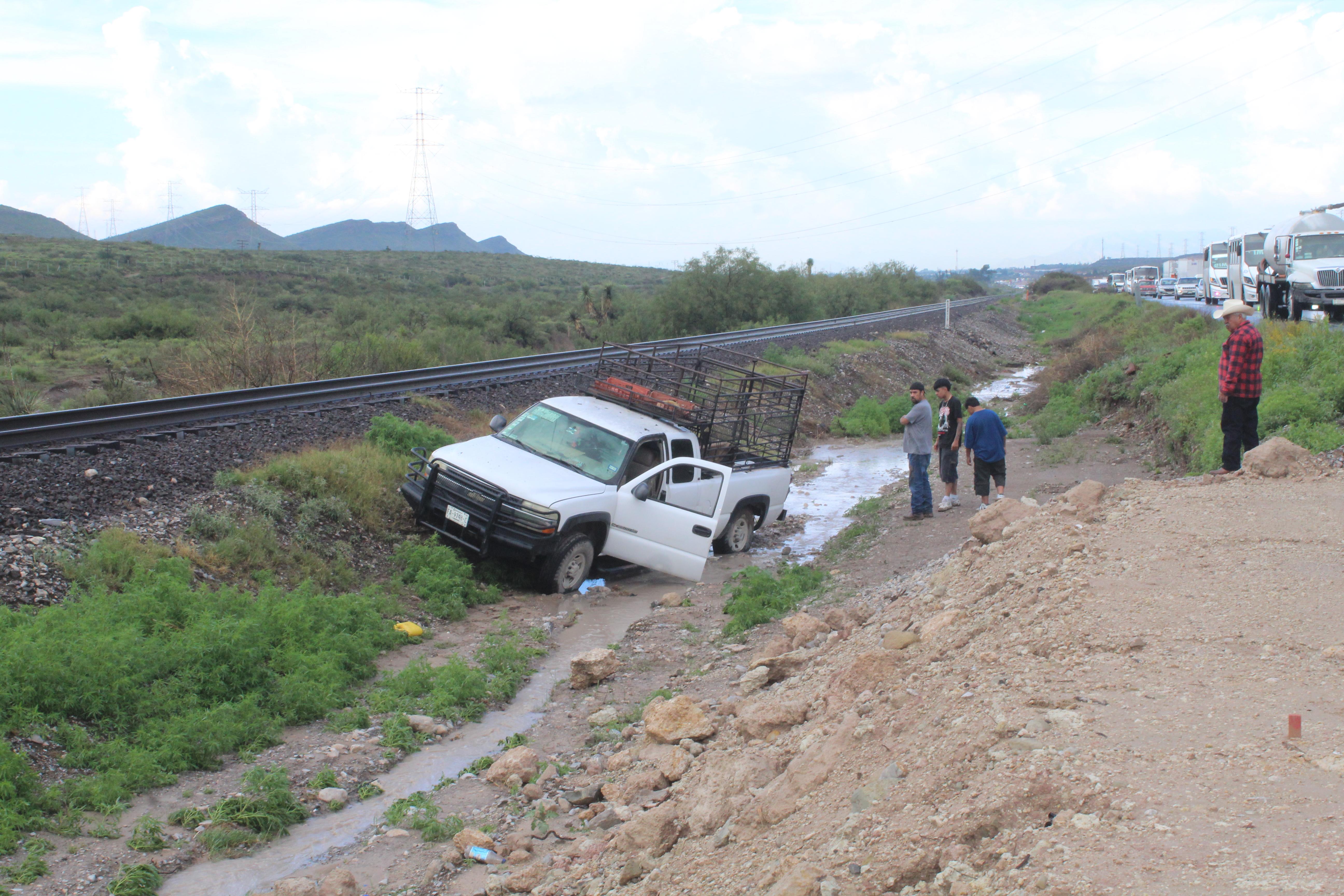 Una camioneta de redilas estuvo a punto de ser arrastrada por la corriente la tarde de este lunes, luego de que su conductor perdiera el control por el exceso de velocidad y el pavimento mojado debido a las lluvias que se registraron al sur de Saltillo.