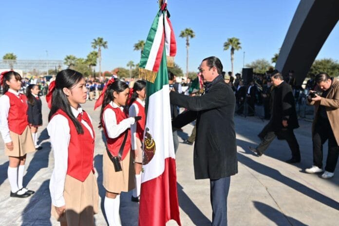 ACUÑA, COAH.- Acompañado de autoridades militares, municipales, organizaciones no gubernamentales, instituciones educativas y civiles, el alcalde Emilio De Hoyos encabezó la conmemoración del Día de la Bandera.