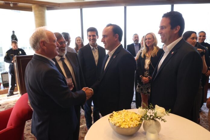 El gobernador de Coahuila, Manolo Jiménez Salinas, cerró su gira de trabajo en Austin, Texas, con una reunión con el alcalde de la capital texana, Kirk Watson, y con empresarios locales, para fortalecer la cooperación entre los dos estados.