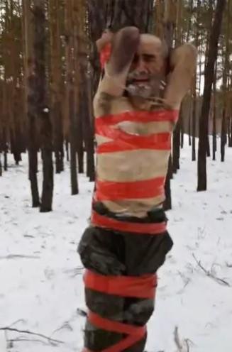 Las impactantes imágenes de video, obtenidas por East2West, muestran a dos soldados atados a árboles, prácticamente sin ropa, en un frío adormecedor.