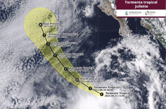 De acuerdo con las especificaciones, la tormenta está generando lluvias fuertes y oleaje elevado en Baja California Sur. “El centro de la tormenta tropical Juliette se localiza a 760 km al suroeste de Cabo San Lucas, B.C.S.”; también es importante mencionar que el fenómeno lleva vientos máximos sostenidos de 95 km/h, rachas de 110 km/h y desplazamiento hacia el oeste-noroeste a 22 km/h.