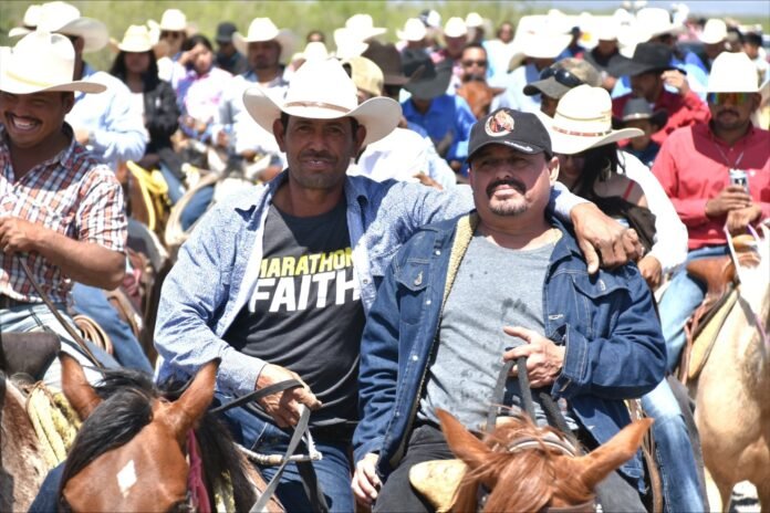 Cerca del medio día, los jinetes se dieron cita para recorrer con familias de los fundadores la cabalgata, camionetas, trailas y carruchas decoradas con nombres de los matrimonios, se formó el contingente que a todo volumen disfrutó de música norteña.