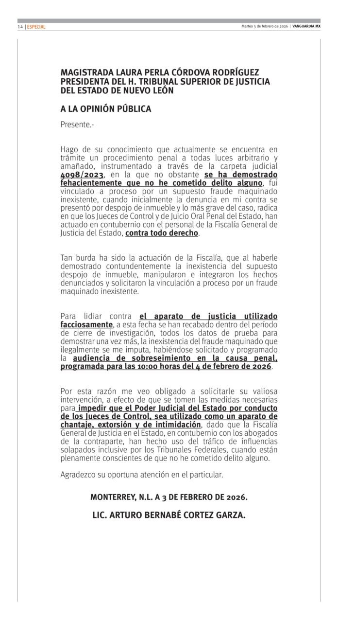 Para lidiar contra el aparato de justicia utilizado facciosamente, a esta fecha se han recabado dentro del período de cierre de investigación, todos los datos de prueba para demostrar una vez más, la inexistencia del fraude maquinado que ilegalmente se me imputa, habiéndose solicitado y programado la audiencia de sobreseimiento en la causa penal, programada para las 10:00 horas del 4 de febrero de 2026.