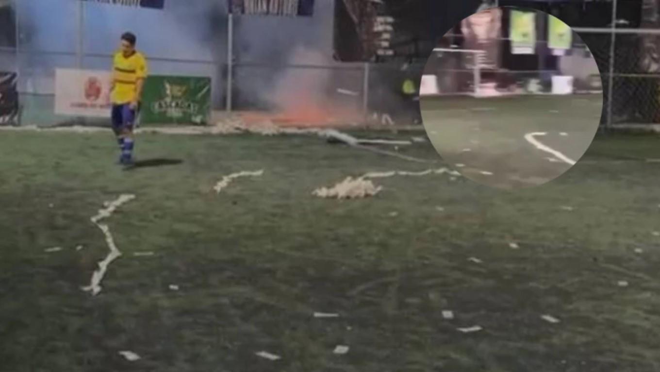 Uno de los jugadores aturdido al piso en el terreno de juego, luego de la detonación de las bengalas.