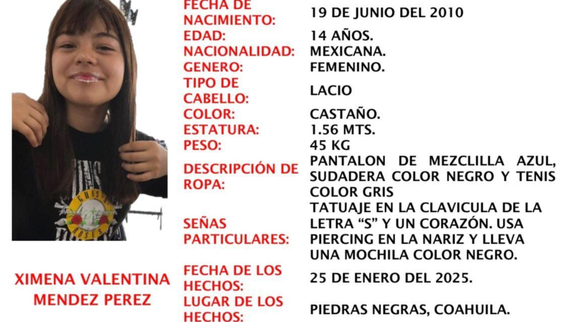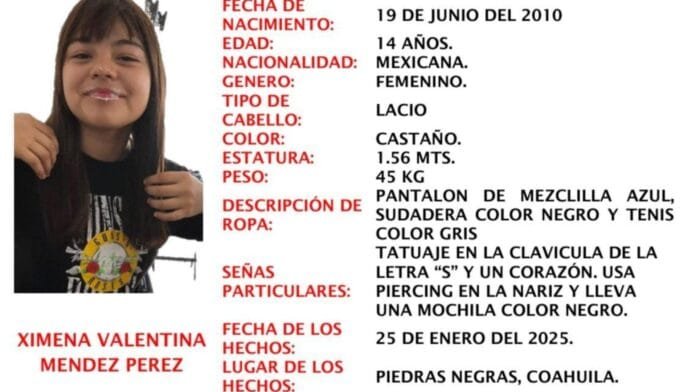 El pasado 25 de enero, Ximena Valentina Méndez Pérez, una adolescente de 14 años, fue vista por última vez en la colonia Valle de las Flores, en Piedras Negras, Coahuila. Su desaparición fue reportada al día siguiente, encendiendo las alarmas entre sus familiares y las autoridades locales.