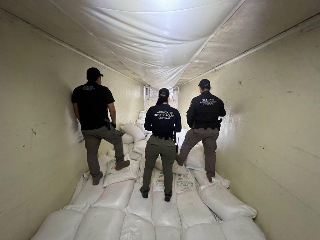 Omar García Harfuch, secretario de Seguridad y Protección Ciudadana (SSPC), informó que en Los Mochis, Sinaloa, fueron detenidas dos personas, acusadas por delitos contra la salud, tras asegurar 320 kilogramos de metanfetamina, ocultos en tractocamión de la marca Volvo con una caja refrigerada.