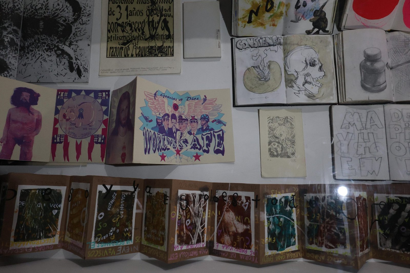 “Mi obra es más enfocada a la pintura, e incluso a la música, pero el dibujo es constante y cotidiano, entonces siempre tengo mis libretas”, comentó Monsiváis, “planteamos una revisión de esas libretas y hacer un bonche y jugar a que los dibujos establezcan sus propias relaciones sin ordenarlas por tiempo, tema ni nada, simplemente tomar una nube gigantesca, un poco al azar”.