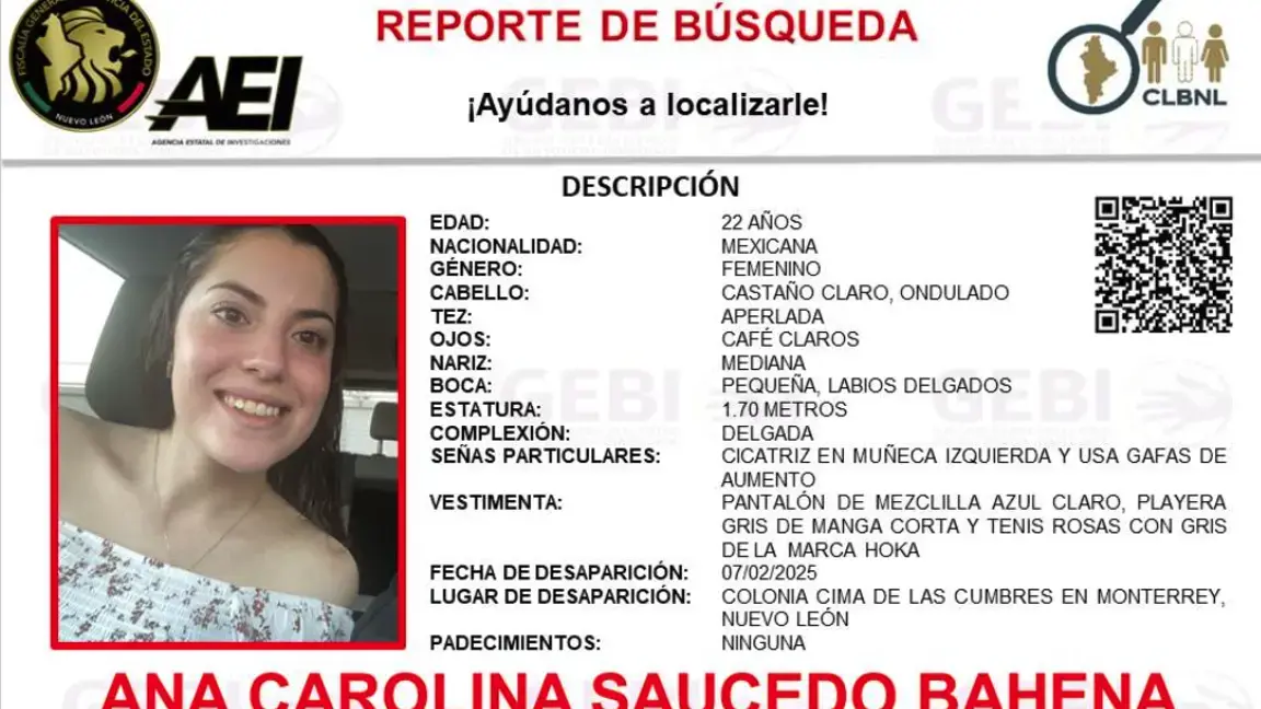 TE PUEDE INTERESAR: Piden ayuda para localizar a Ana Carolina Saucedo, joven desaparecida en Monterrey