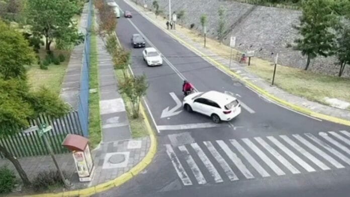 Momentos después, en la imagen aparece una camioneta blanca, la cual intenta incorporarse de manera imprudente e invade el carril contrario al dar una vuelta sobre la misma vialidad.