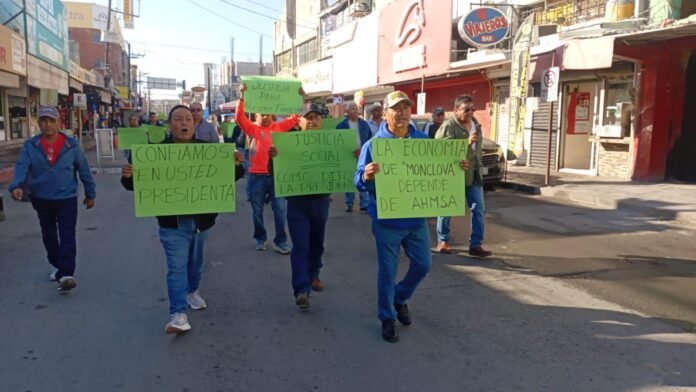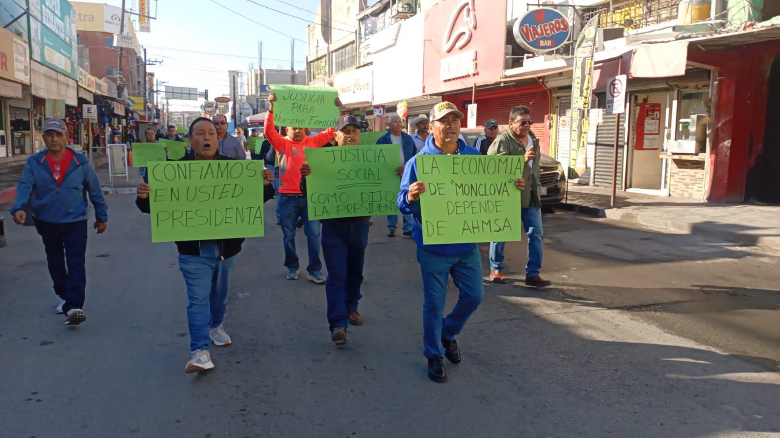MONCLOVA, COAH.- Extrabajadores de Altos Hornos de México (AHMSA) marcharon este miércoles por las calles de la Zona Centro de Monclova como muestra de protesta ante el nuevo aplazamiento en la subasta de los activos de la empresa, acción que consideran una prolongación injustificada del conflicto laboral que mantiene en crisis a cientos de familias.
