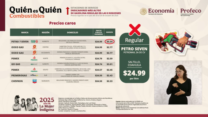 Durante la conferencia matutina encabezada por la presidenta de México, Claudia Sheinbaum, el titular de la Procuraduría Federal del Consumidor (Profeco), César Iván Escalante Ruiz, presentó la más reciente actualización del programa “Quién es quién” en los precios de combustibles, donde destacó que una gasolinera ubicada en Saltillo, Coahuila, registró el precio más elevado a nivel nacional.