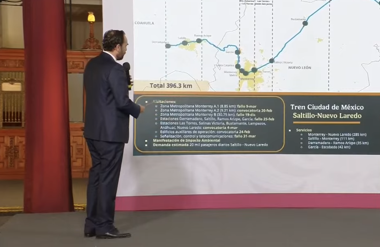 Andrés Lajous, Titular de la Agencia Reguladora del Transporte Ferroviario, reportó los avances en la construcción del tramo de Saltillo a Nuevo Laredo, mencionando que ya se habían licitado y ya estaban en obra los tramos más largos que están al sur y norte de Monterrey.