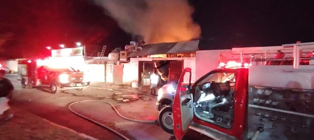 El fuego consumió principalmente material plástico, botes de aluminio y costales almacenados en el lugar.