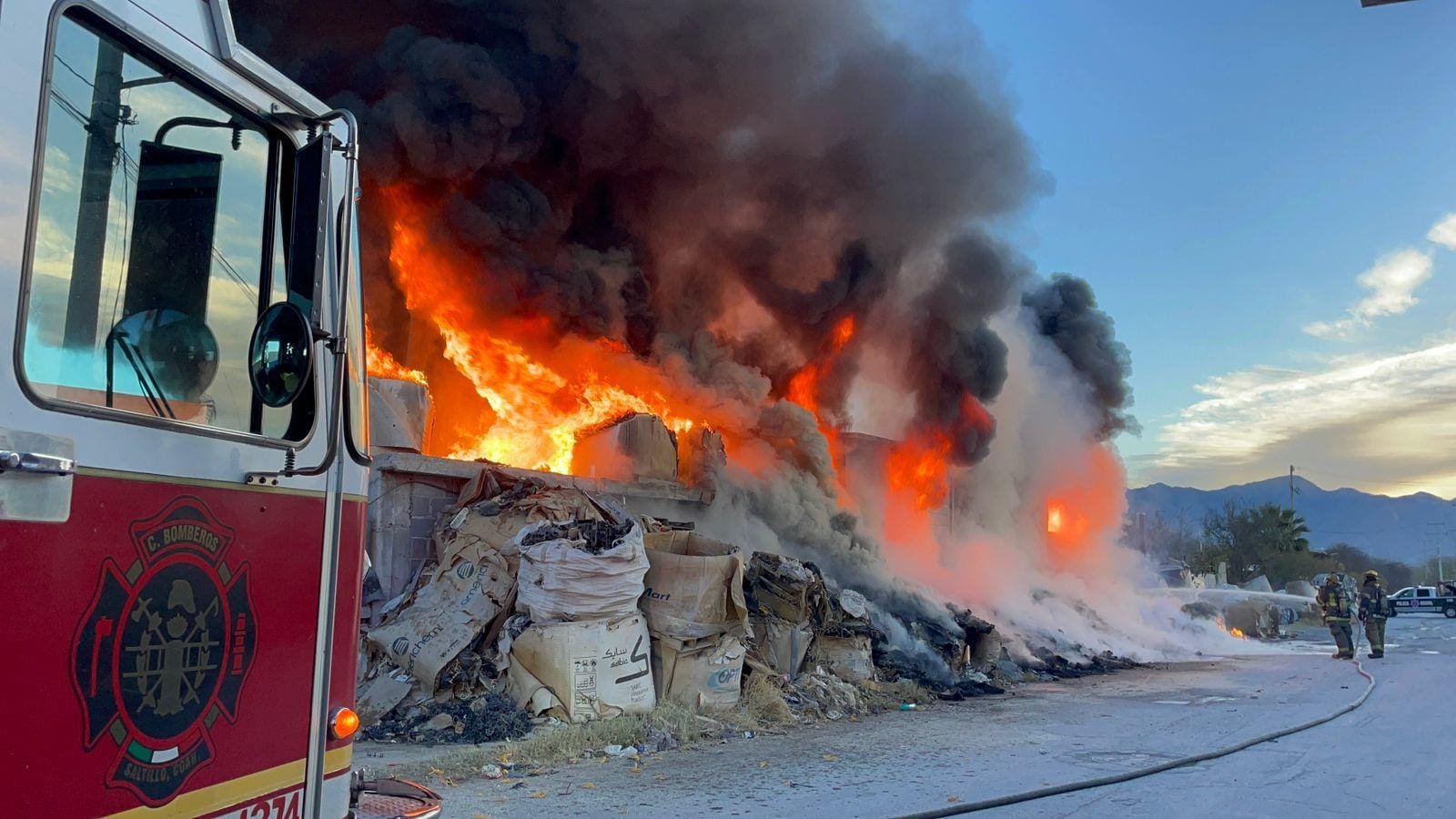Debido al material plástico y cartón que ardía, los bomberos tuvieron que atacar el fuego desde dos frentes, ya que resultaba complicado extinguirlo solo desde un punto. Con el paso del tiempo, el humo fue adquiriendo un tono gris, a medida que se consumía el plástico y el scrap automotriz en las llamas.