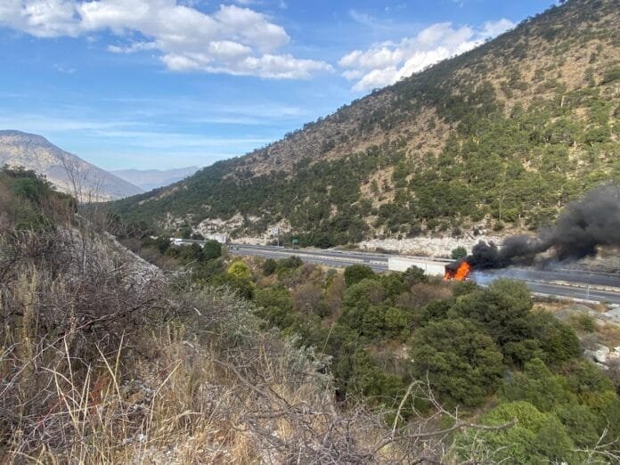 El siniestro ocurrió en el kilómetro 225, en el carril con dirección a Matehuala, lo que llevó al cierre de la circulación en ambos sentidos por aproximadamente dos horas. Personal de bomberos de Arteaga logró controlar las llamas tras 45 minutos de labores, sin embargo, la cabina del vehículo quedó completamente calcinada y el remolque, que transportaba material de construcción, sufrió daños en un 50%.