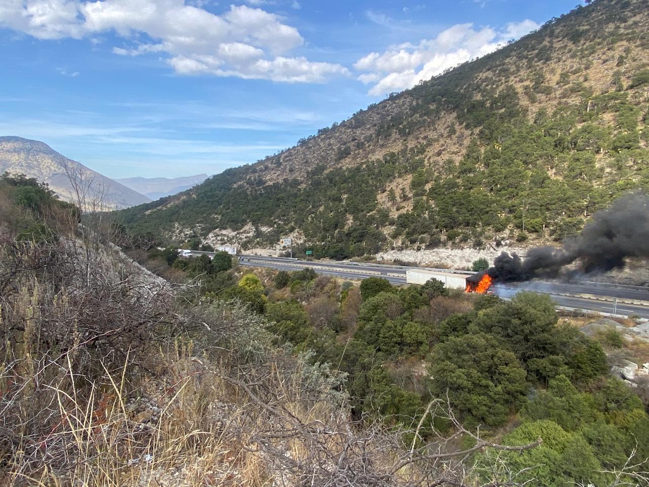 La tarde de este jueves, un tráiler que transitaba por la carretera federal en el tramo Saltillo-Los Chorros sufrió un incendio, generando caos vehicular y movilización de servicios de emergencia.