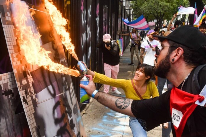 Un contingente de integrantes de la marcha Orgullo LGBTTTIQ+ que marchaban por Avenida Reforma quemó una serie de fotografías de una exposición que destacaba la labor de la Guardia Nacional y del Ejército Mexicano.