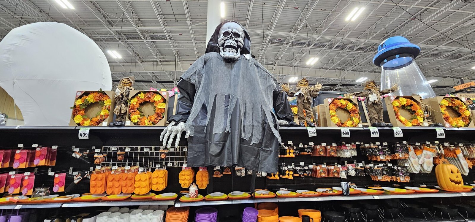 En establecimientos como HEB y Maxichina, la transformación es evidente. Apenas cruzando la entrada, el cliente se topa de inmediato con grandes exhibiciones de calabazas de plástico, telarañas, disfraces, y una amplia variedad de artículos para las festividades anglosajonas y mexicanas de finales de octubre y principios de noviembre.