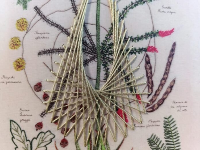La obra original —que ya se vendió—, un pendón bordado a manera de las viejas ilustraciones botánicas, muestra a siete especias nativas de la región —gobernadora, trompillo, ocotillo, mezquite, huizache, encino y lechuguilla—, a su vez registradas por ella y el maestro Radko Tichavsky en un manual botánico de la Sierra de Zapalinamé que sigue en construcción.