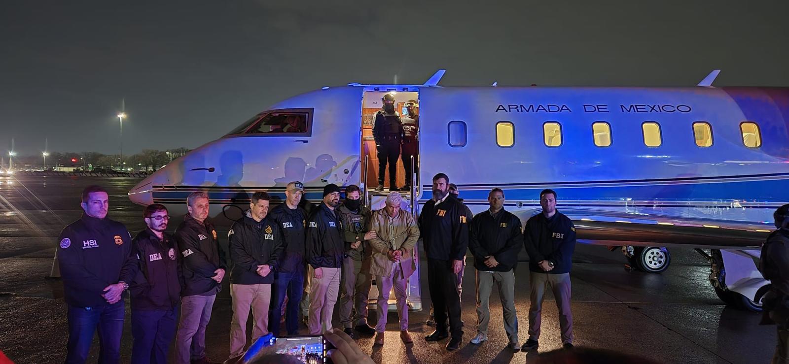El capo mexicano bajó de un avión de la Armada de México a sus 72 años de edad, encorvado y rodeado de decenas de elementos de Administración de Control de Drogas (DEA), con el cabello canoso, muy alejado al tinte negro presentado en su detención de julio de 2022.