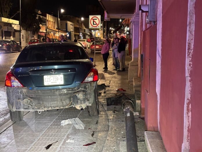 El conductor de un vehículo de la marca Nissan terminó derribando una luminaria e impactándose contra un automóvil de la marca MG, tras perder el control del volante mientras perseguía un automóvil que lo había chocado, esto en la zona centro de Saltillo.