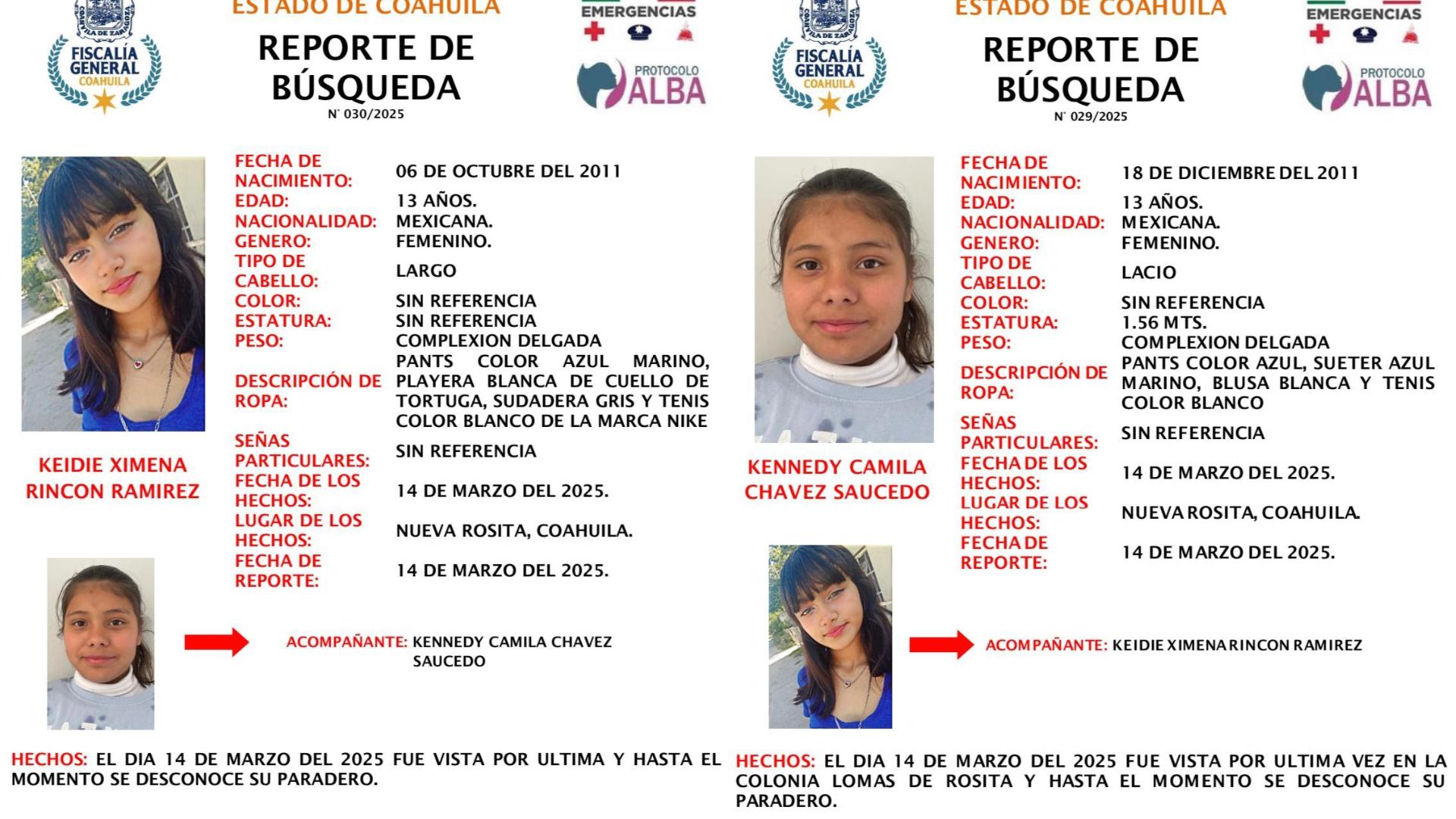 NUEVA ROSITA, COAH.- Keidie Ximena N y Kennedy Camila N, ambas de 13 años, fueron localizadas sanas y salvas por elementos de la Fiscalía General del Estado de Coahuila (FGE) tras ser reportadas como desaparecidas desde el viernes. Las adolescentes habían intentado huir de su hogar, aunque hasta el momento se desconocen las razones que las llevaron a tomar esa decisión.