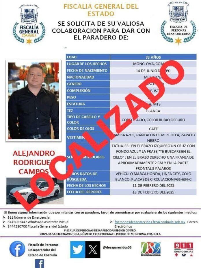 MONCLOVA, COAH.- La Fiscalía de Personas Desaparecidas Región Centro, en coordinación con la Agencia de Investigación Criminal y autoridades municipales y estatales, informó este día sobre la localización de Alejandro Rodríguez Campos, quien había sido reportado como desaparecido el pasado 13 de febrero.