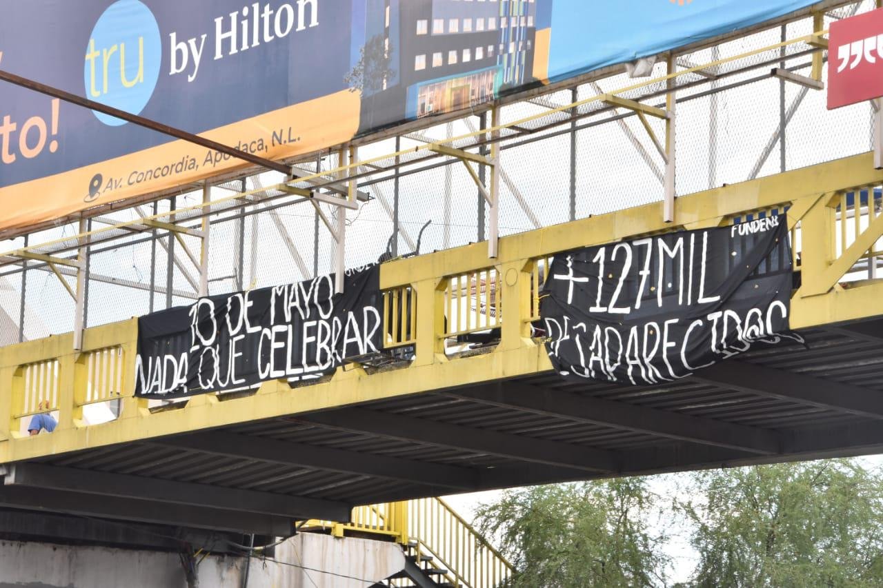 Por su parte, Fuerzas Unidas por Nuestros Desaparecidos en Nuevo León (Fundenl) colocaron mantas para destacar que no hay nada que celebrar este 10 mayo ante la desaparición de sus hijas e hijos.