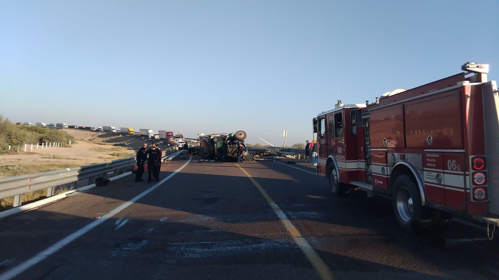 MATAMOROS, COAH.- La volcadura de un tráiler cargado con polines de aluminio generó la movilización inmediata de cuerpos de emergencia la mañana de este martes alrededor de las 7:00 horas, en el kilómetro 30 + 900 del libramiento Laguna Norte.