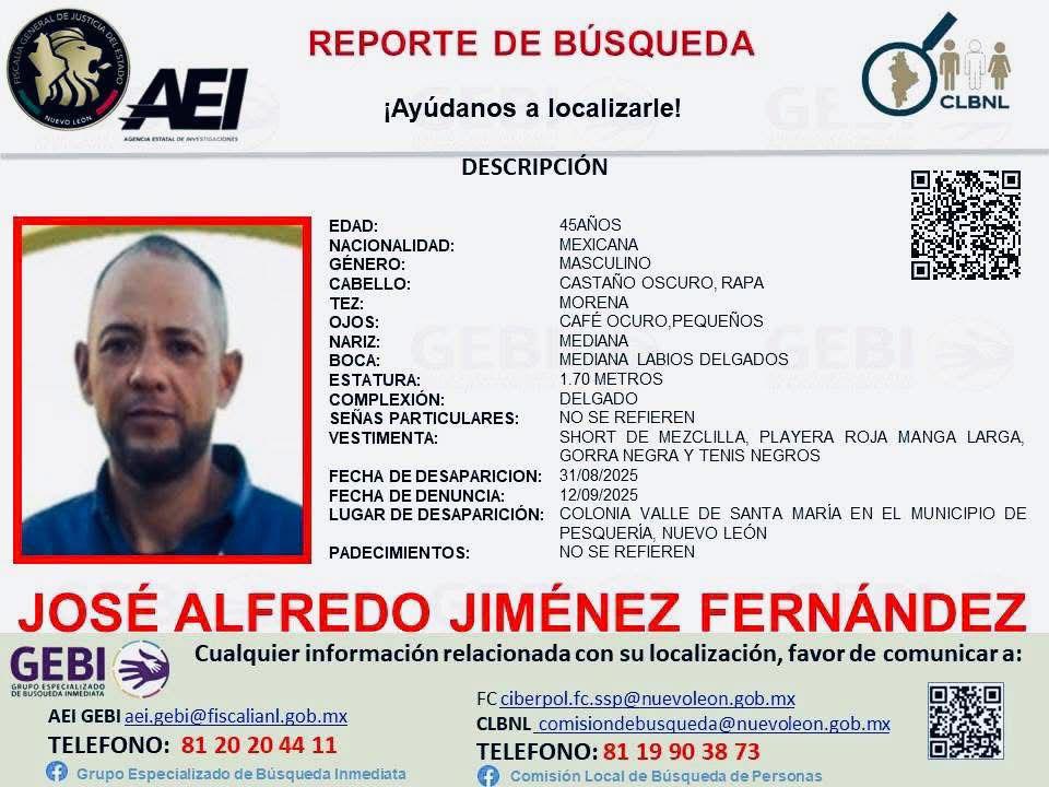 MONCLOVA, COAH.- Familiares, amigos y autoridades han intensificado la búsqueda de José Alfredo Jiménez Fernández, originario de Monclova, quien permanece desaparecido desde el 29 de agosto pasado en el municipio de Pesquería, Nuevo León.