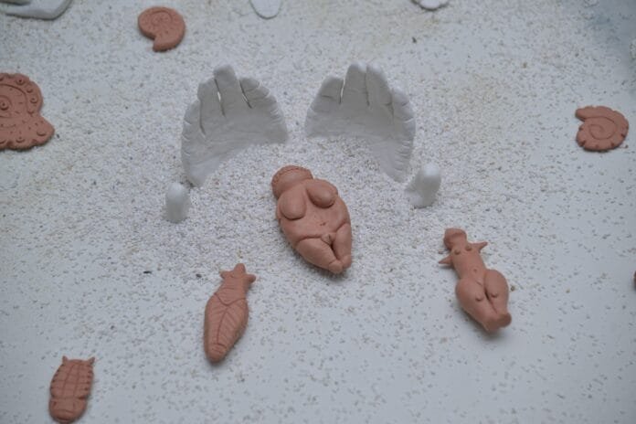Ya sea con dinosaurios que emulan la representación naif que en la infancia hacemos de estos seres, o la versión más realista de lo que se encuentra en este árido paisaje, el barro cocido se encarga de darle forma. Pero también, en una tercera instalación, la artista aprovecha este material para hacer piezas de un cariz más íntimo, como expresión de sus emociones y de la feminidad, en un paisaje de roca, arena y agua que se extiende por el suelo de la sala.