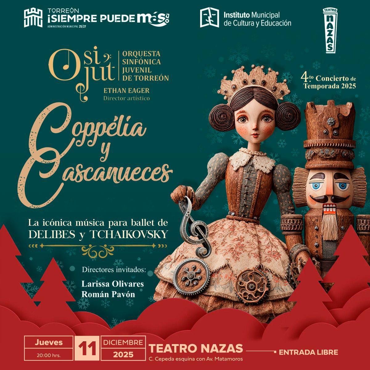 TORREÓN, COAH.- La Orquesta Sinfónica Juvenil de Torreón (OSIJUT) ofrecerá su cuarto concierto de temporada con un programa dedicado a dos clásicos del ballet: Coppélia, de Léo Delibes, y El Cascanueces, de Piotr I. Tchaikovsky. La presentación será el jueves 11 de diciembre a las 20:00 horas en el Teatro Nazas, con entrada libre.