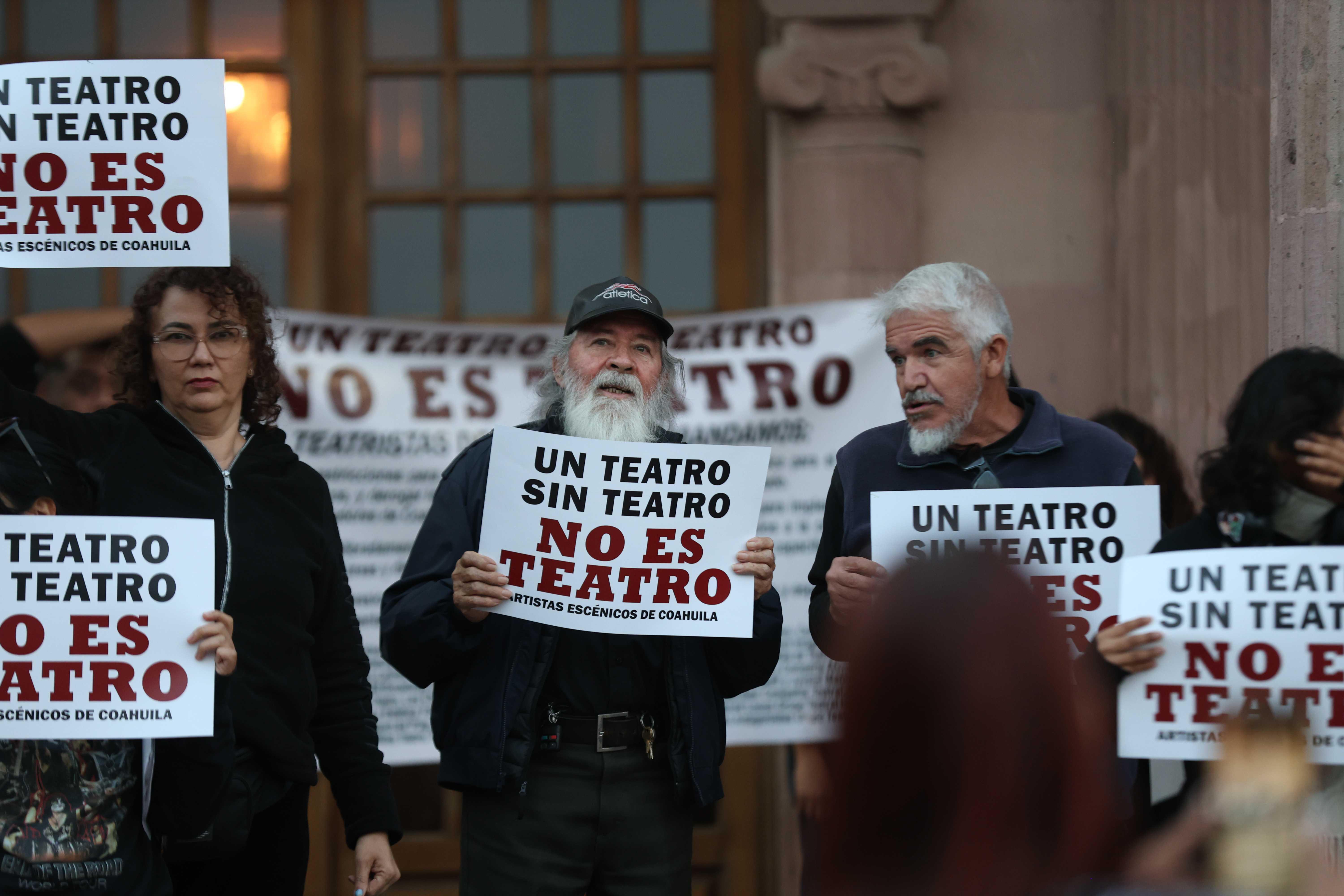 Con pancartas y lonas en las que se leía la leyenda “Un teatro sin teatro no es teatro” miembros del gremio teatral coahuilense se manifestaron de forma pacífica ante la las restricciones para el uso de espacios públicos y la inactividad de los mismos, la mala distribución del presupuesto para cultura a nivel estatal y la falta de recursos para la producción, difusión, capacitación y formación teatral, entre otros puntos.