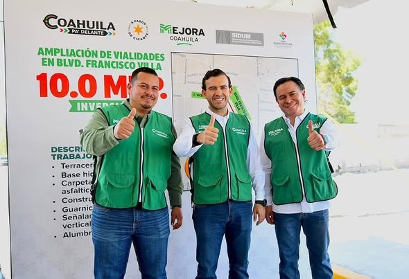 ***El alcalde Javier Flores, de San Buenaventura, el coordinador Gabriel Elizondo Pérez del equipo de Mejora Coahuila, y el sub secretario Sergio Sisbeles, dieron inicio a la ampliación de vialidades del Blvd. Francisco Villa, con una inversión de 10 millones de pesos…