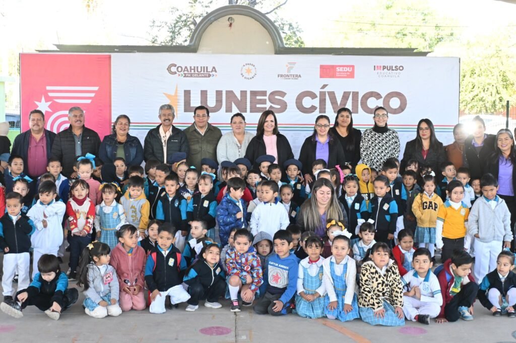 *** Manteniendo su cercanía con la comunidad escolar del municipio, la alcaldesa Yesica Sifuentes Zamora encabezó la ceremonia del lunes cívico en la Escuela Primaria Dr. Rafael Cepeda, donde realizó la entrega de material educativo y reafirmó su compromiso con el fortalecimiento de los valores y la educación en Castaños. El acto contó con la presencia de miembros del cabildo, docentes, alumnos y padres de familia, quienes participaron con entusiasmo en la ceremonia que marca el inicio de la semana escolar y promueve la unidad, el civismo y la cercanía social…