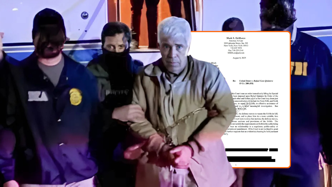 En una moción escrita dirigida al juez Frederic Block, el abogado Mark DeMarco, en representación del equipo defensor, compuesto únicamente por abogados designados por la Corte, pidió modificar las condiciones de reclusión. Argumentó que las restricciones vigentes dificultan la preparación de la defensa y ponen en riesgo la salud física y mental de Caro Quintero.