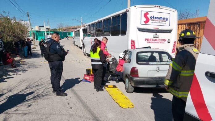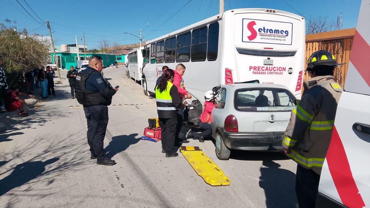 Un automóvil compacto se impactó contra una camioneta y un autobús de transporte de personal que, por fortuna, no tenía pasajeros y se encontraba estacionado en calles de la colonia Mirador de Ramos Arizpe.