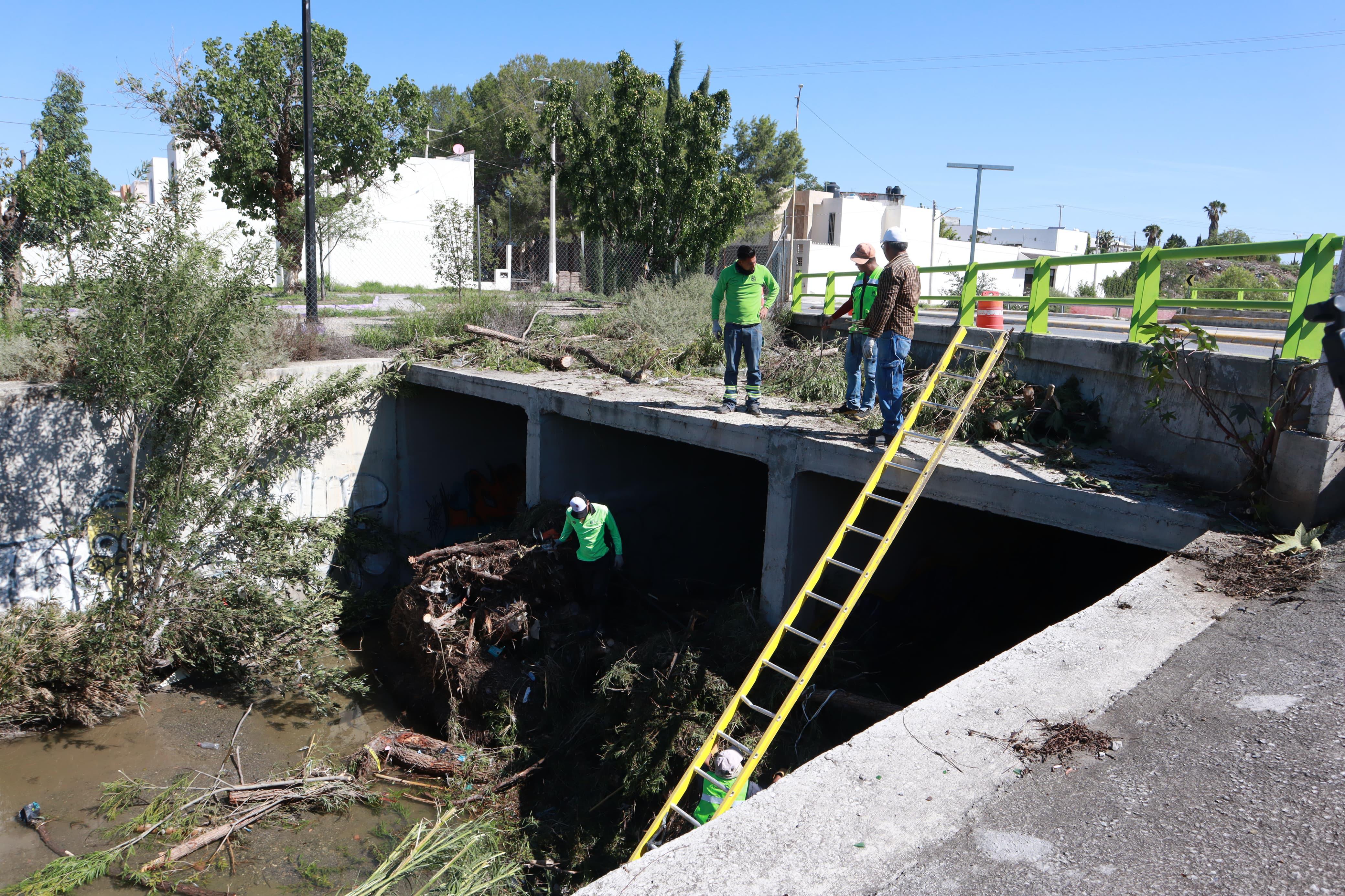 Entre las acciones más destacadas se encuentra el destape del arroyo Ceballos en su cruce con el bulevar José María Rodríguez, a la altura de la colonia Alpes Norte, donde personal de la Dirección de Medio Ambiente y Desarrollo Sustentable retiró grandes cantidades de basura, escombro y desechos orgánicos que impedían el libre flujo del agua en este cauce natural.