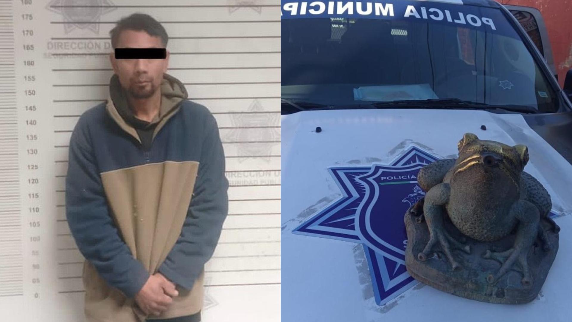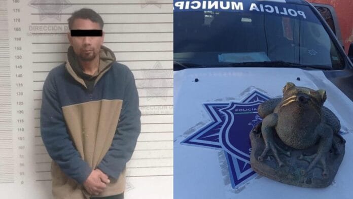 Utilizando el sistema de videovigilancia del Centro de Control y Comando (C2), elementos de la Policía Municipal detuvieron a un hombre identificado como Cristian Adrián “N”, de 32 años, quien fue sorprendido intentando sustraer esculturas de rana en la Alameda Zaragoza.