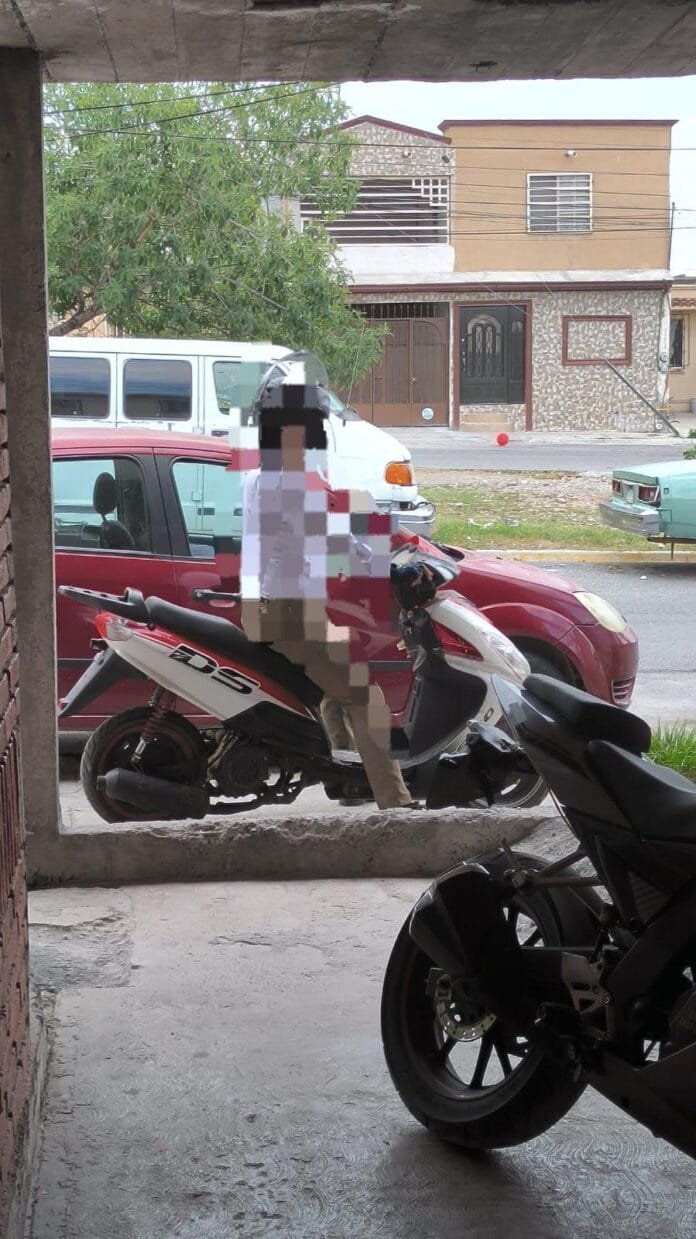 Vecinos captaron en video a dos personas a bordo de una motocicleta Italika 150Z, quienes ayudaron a otra persona a sacar la moto afectada de la cochera.