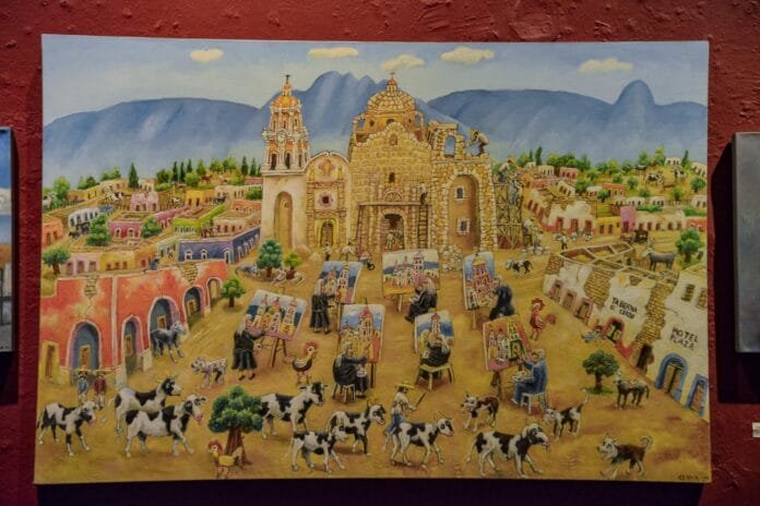 Este 2024 Geroca se fue a pintar la Catedral al pasado, al siglo 19, cuando el campanario apenas comenzaba a tomar forma. Se fue a un Saltillo donde el Cerdo de Babel es un establecimiento centenario, ubicado frente a la Plaza de Armas, a unirse al grupo de pintoras que ya vislumbran el templo terminado en sus lienzos.